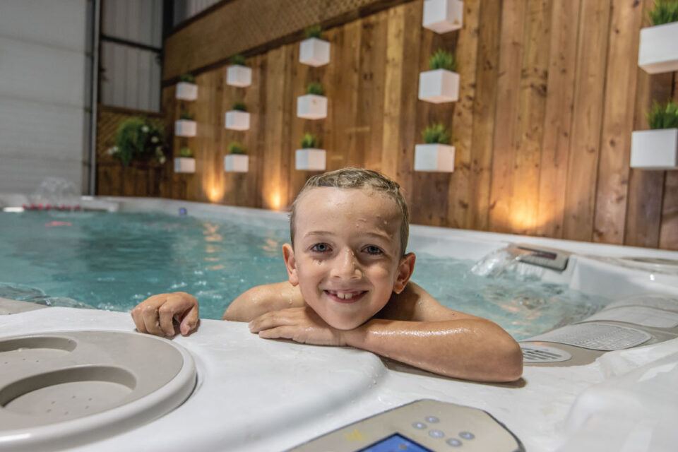 Matty Hyde plays in a swim spa in his parents’ CK Spas showroom. (Photo Credit: Dana Hyde)