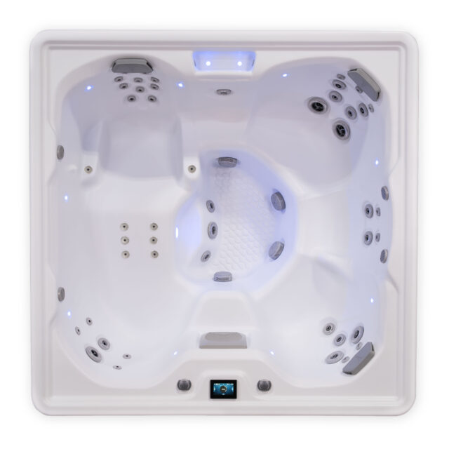 Small refinements add big value. The tubs feature enhanced exterior corner lighting and an upscale lit logo badge. Adjustable pillows move up and down for personalized comfort, and the reworked cabinet attachment system eliminates exposed screws, improving aesthetics and service access. “We try to be cognizant of service issues,” Scheble says. “In addition to making the spa look pretty and function well for the consumer, we also keep in mind the needs of the dealers and service techs.”