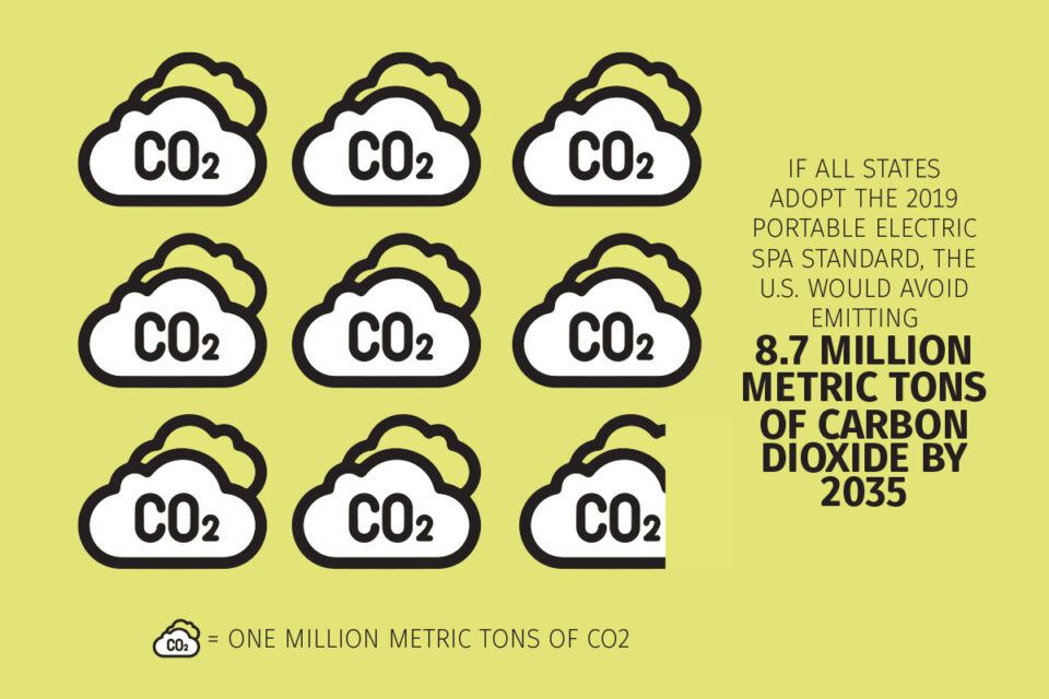 After analysis of the standard, The Appliance Standards Awareness Project says, “Ensuring that all spas sold meet the 2019 standard would save 23 billion kilowatt-hours of electricity by 2035. If all states adopt the 2019 portable electric spa standard, the U.S. would avoid emitting 8.7 million metric tons of carbon dioxide by 2035, equivalent to one year of greenhouse gas emissions of more than 1.8 million cars.”