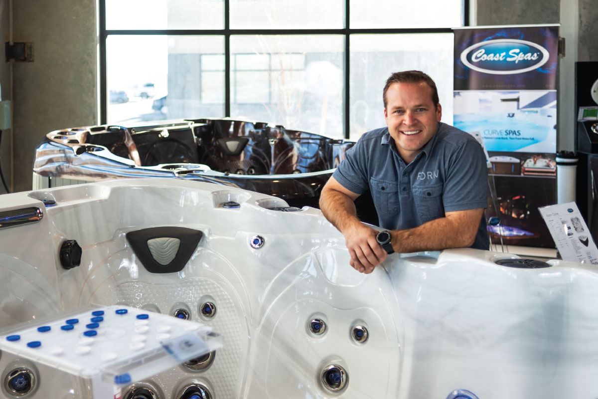 In the retail location — which he built with his own team — every detail has been meticulously thought out. The showroom has 24-foot ceilings and natural evergreens, pergolas, pop-up decks and outdoor furniture to create outdoor entertainment spaces on the showroom floor. “That is what sells people on a hot tub,” Galloway says. “It’s to create that fully immersive experience for the client. A prefab hot tub is a hard thing to sell unless somebody can experience it, see it and really sit in it and enjoy it.”