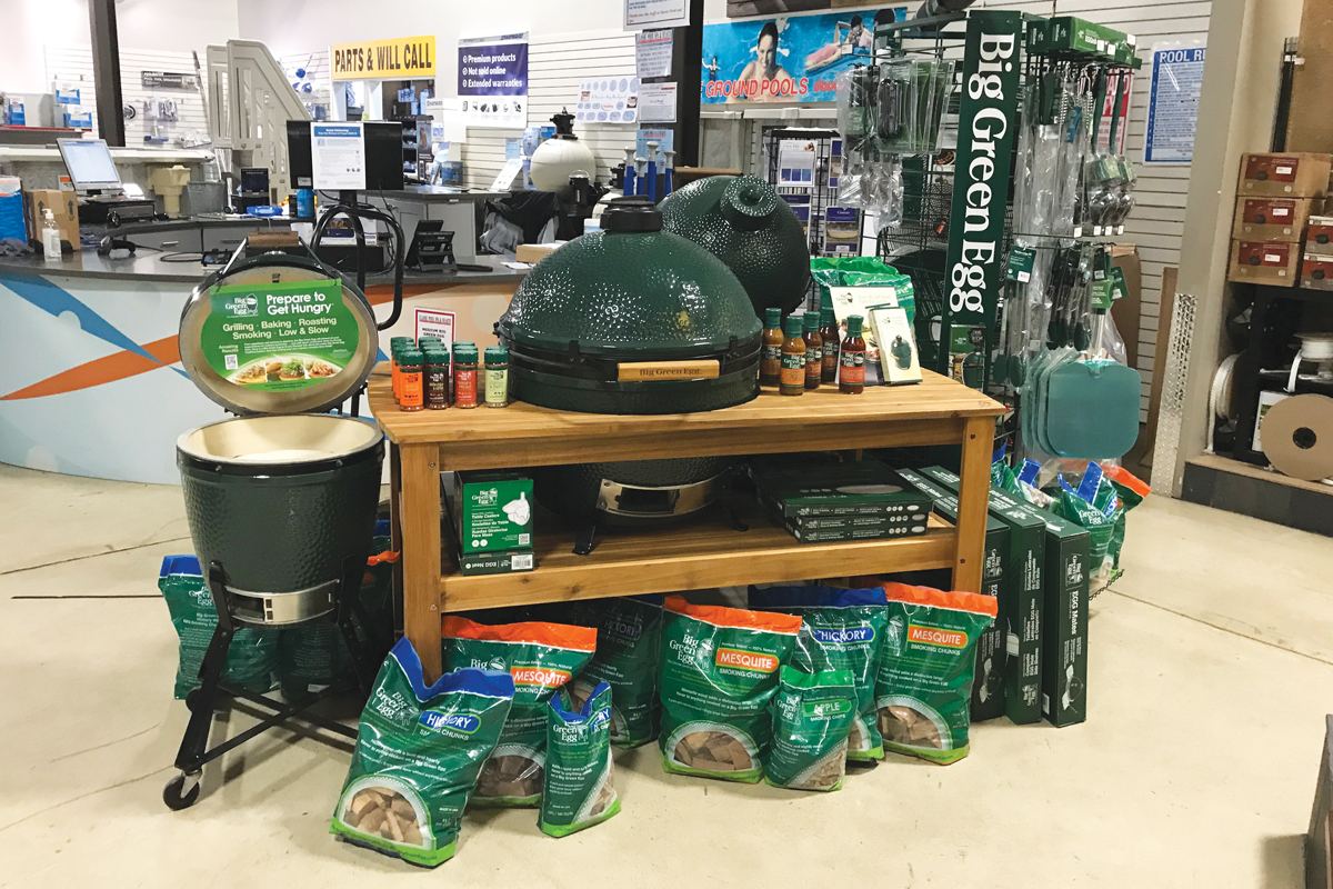 Classic Pools & Spas in Gladstone, Oregon, has some inspirational ideas. There are merchandise pods dotted around the selling floor, each with a seasonal product. Traeger had a display area taking up about 28 square feet with a selection of barbecue sauces and seasonings on the top and pellets below. Grill covers in boxes backed up the display area with boxed Traeger Tailgater sets to the left. This pod made it easy for one or two people to shop without bumping into other customers. Another outdoor grill pod was about 7 feet away, filled with Big Green Egg merchandise. This area took up more space but easily allowed customers to travel around it safely.