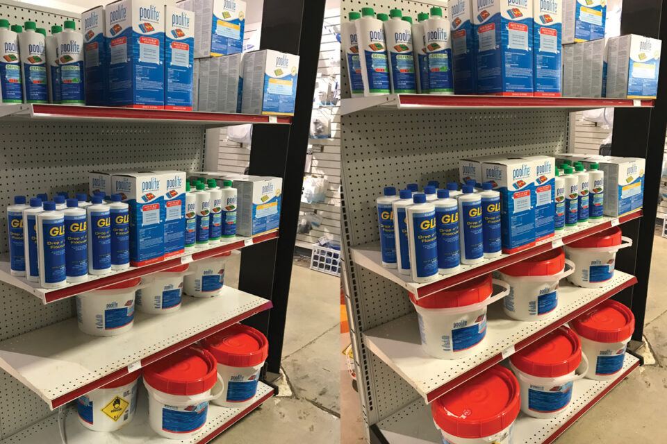 I was curious about the chemicals and asked a sales associate if there were any problems keeping popular products in stock. He laughed, nodded and told me to look around at the emptier-than-normal space. Shipments have been coming in slower and more erratically, he told me, and planning ahead hasn’t seemed to help. With his permission, I made a few changes to the gondola shelves so I could take before and after photos.