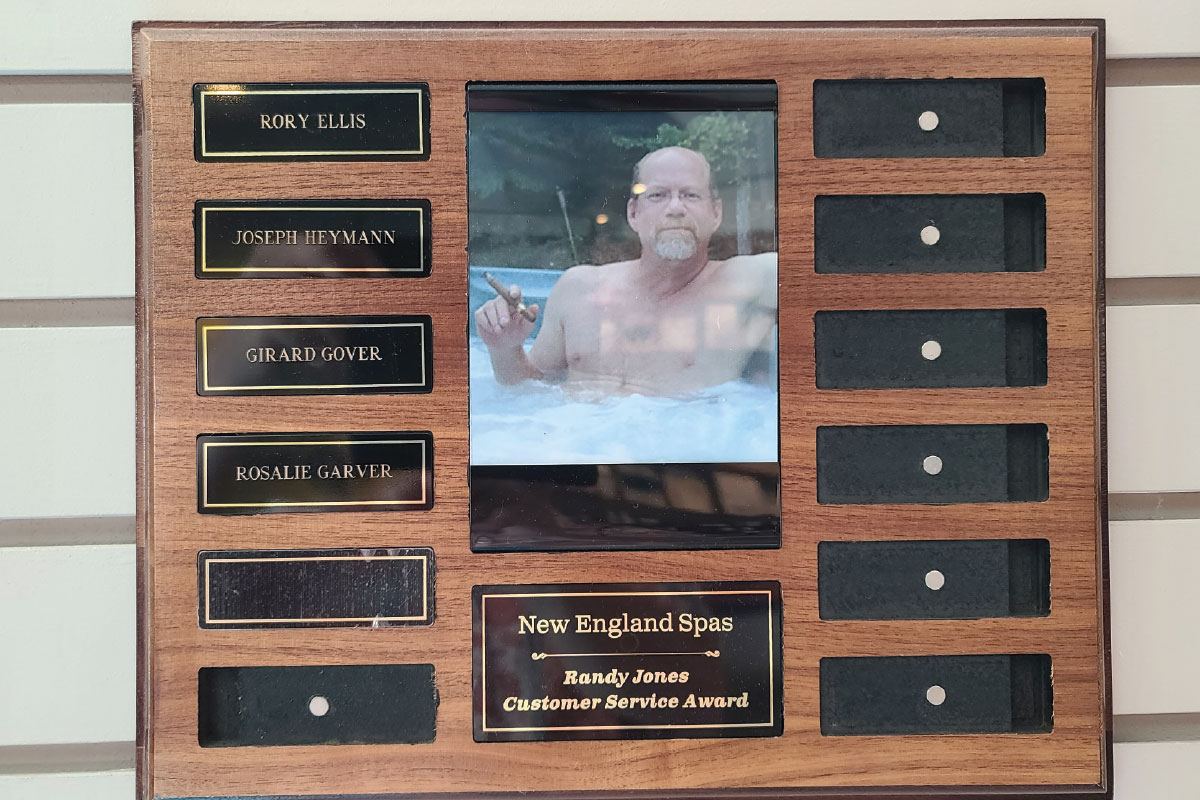 New England Spas staff can nominate co-workers or themselves for the award twice a year. A plaque hangs in each of the company’s three showrooms and the operations center that has one of Coburn’s favorite pictures of Jones, sitting in a hot tub smoking a cigar. Recipients’ names are added to the plaque each year. Winners get a personal plaque, a $500 personal check and a $500 donation made in their name to the charity of their choosing.
