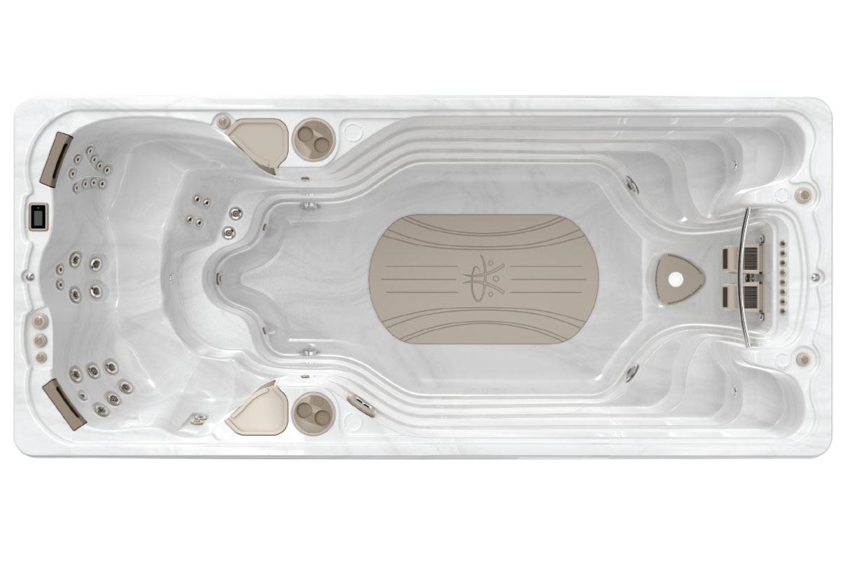 Additionally, the Aquatic collection has a Performance Flow Intake at the end of the swim lane, which helps eliminate the reflective wave turbulence. Caused by swim jets pushing the flow of water to the back of the swim spa, the reflective wave hits the back wall and redirects water flow into the swim lane, Gillespie explains, making for a suboptimal swim experience. “The [Performance Flow Intake] has made a non-turbulent, predictable swim inside the swim spa,” he adds.