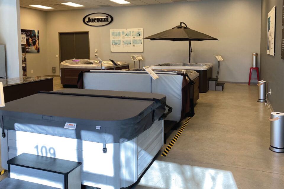 Since opening, Briley has prioritized a COVID-safe showroom, with access by appointment only. Only four hot tubs are displayed to provide the best representation of the models and options available. The floor is taped off to show proper social distancing, and several Molekule air purifiers keep the air clean. Briley says the majority of her customers never request a showroom appointment, however; she mostly does Zoom chats, which she enjoys.