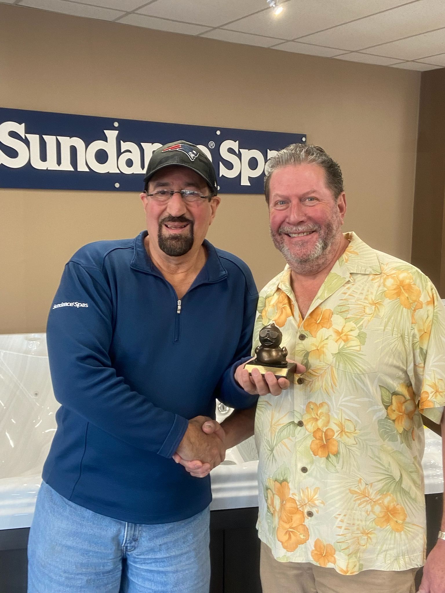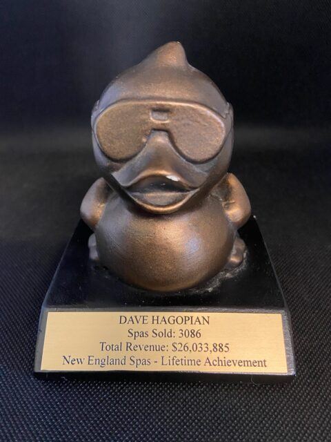 Demonstrating that the feeling is certainly mutual, New England Spas awarded Hagopian its first Lifetime Achievement Award, which came in the form of a bronzed duck wearing sunglasses, and a plaque commemorating his spa sales and revenue achievements. “I wish Dave and his wife many years of health and happiness together,” Coburn adds. “N.E. Spas, and I will always have fond memories of growing up together with team members like Dave!”