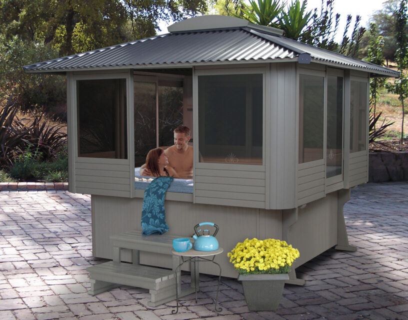 Features: “Basically, it’s a small building that wraps around the hot tub for weather protection and privacy,” Peterson says. Tubtop and open-air, freestanding models available.