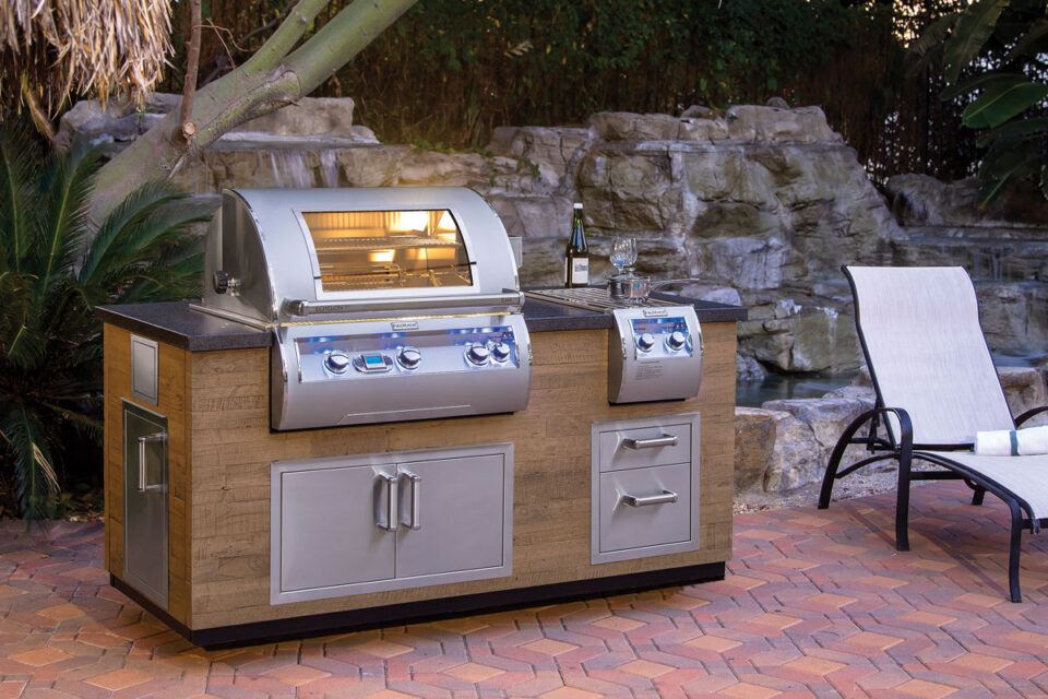 Scott advises showcasing grills in the showroom by displaying them as full outdoor kitchen setups, rather than just the grill equipment. “Placing a grill island that includes the grill, side cooker, drawers, doors and perhaps a sink and refrigerator helps the customer imagine an outdoor kitchen in their backyard,” he says. “Some retailers have also added a seating area and plants to complete the picture.”