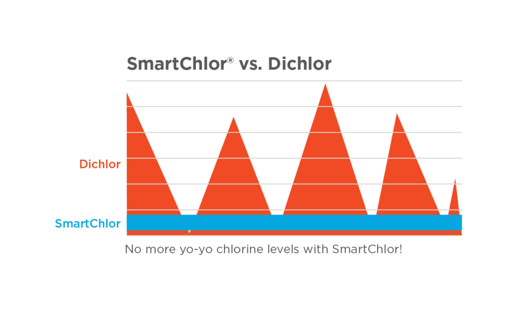 Ease of use is a big factor. Cartridges are prefilled so there’s no measuring. SmartChlor releases continuously and slowly, adding more chlorine to meet demand, keeping a consistent 0.5 – 1.0 ppm chlorine level at all times. It contains no CYA so there’s no CYA buildup, which means draining and refilling can be put off for months.