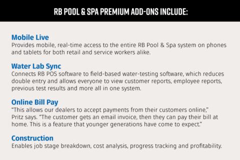 “It’s an all-in-one software solution,” says Rachael Pritz, executive director of RB Retail & Service Solutions. “A lot of customers are running QuickBooks for point of sale, then they have to take all the information from there and enter it into their water-testing software. With our interface, your customer receives a water test and you just enter the information. Then it’s automatically entered into RB so there’s no duplicate entry. It saves time, streamlines the processes and ties the whole thing together.”