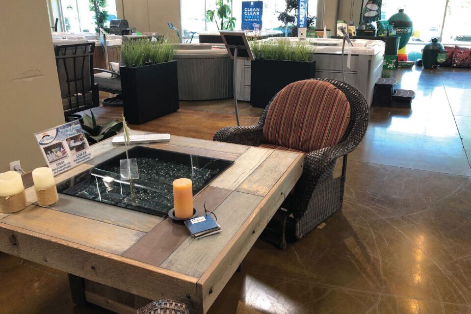 A fire pit by The Outdoor GreatRoom Company sits on display in The Spa & Sauna Co. showroom floor. Fire pits and chat sets are great showroom filler products for the current hot tub shortage. Photo: The Spa & Sauna Co.