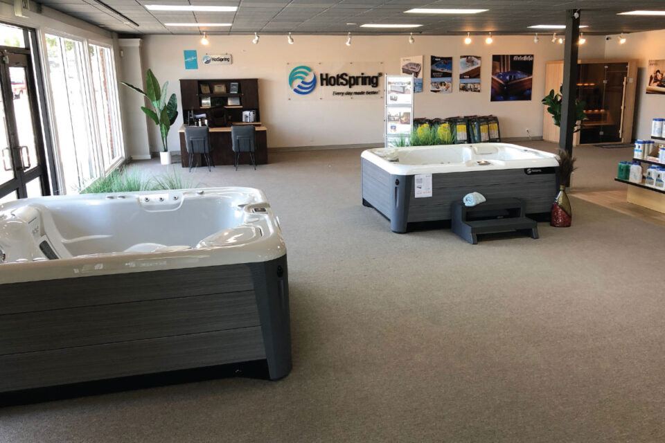 Hot Spring hot tubs sit on display in The Spa & Sauna Co. showroom in Campbell, California. Due to the current hot tub shortage, the showroom — which normally has 25 or more spas, plus three swim spas — is more wide-open than usual. Owner Scott Clark has been using pool tables and saunas to fill the space. Photo: The Spa & Sauna Co.