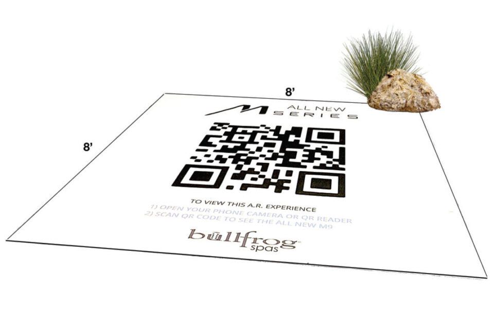 Bullfrog Spas has several dealers using large QR codes that launch Bullfrog’s augmented reality (AR) virtual spa viewing technology in the showroom. The codes are printed about the size of a spa footprint and placed on the floor where a spa would normally be.